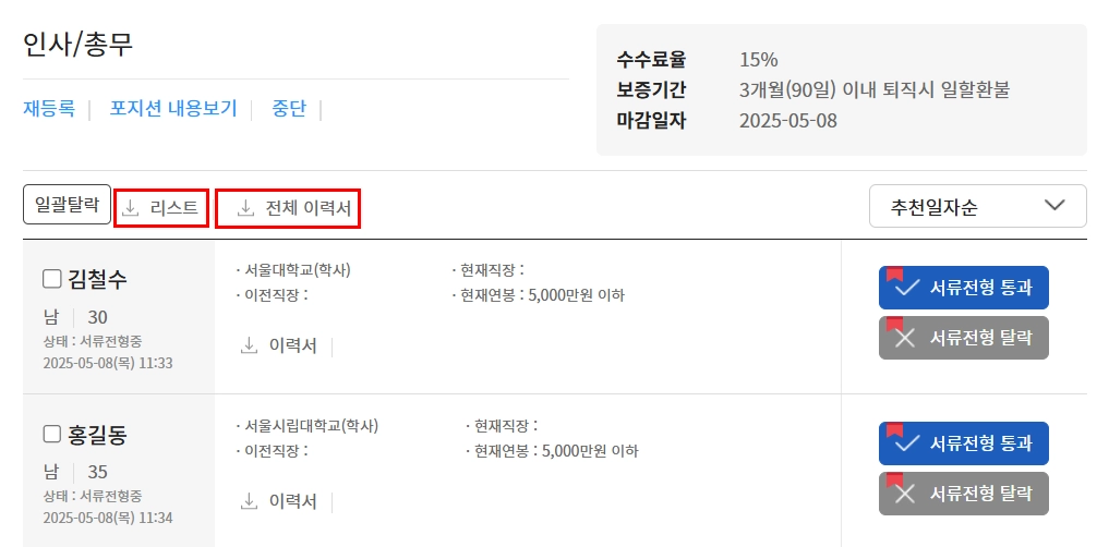 일괄 검토 시, 상단에 후보자 ‘리스트’ 및 ‘전체 이력서’ 다운로드 가능합니다.
