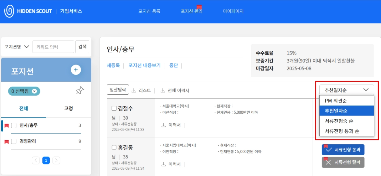 → 서류 통과한 후보자 순서대로 확인할 수 있어, 면접 대상 후보자를 파악하는 데 유용합니다.