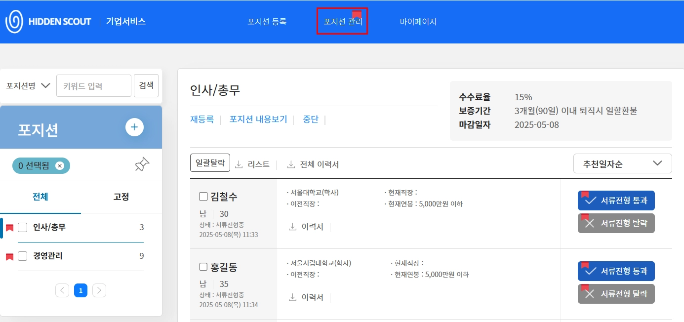 → 현재 서류전형 진행 중인 후보자만 상단에 표시되어, 서류 검토 중인 후보자 확인이 용이합니다.